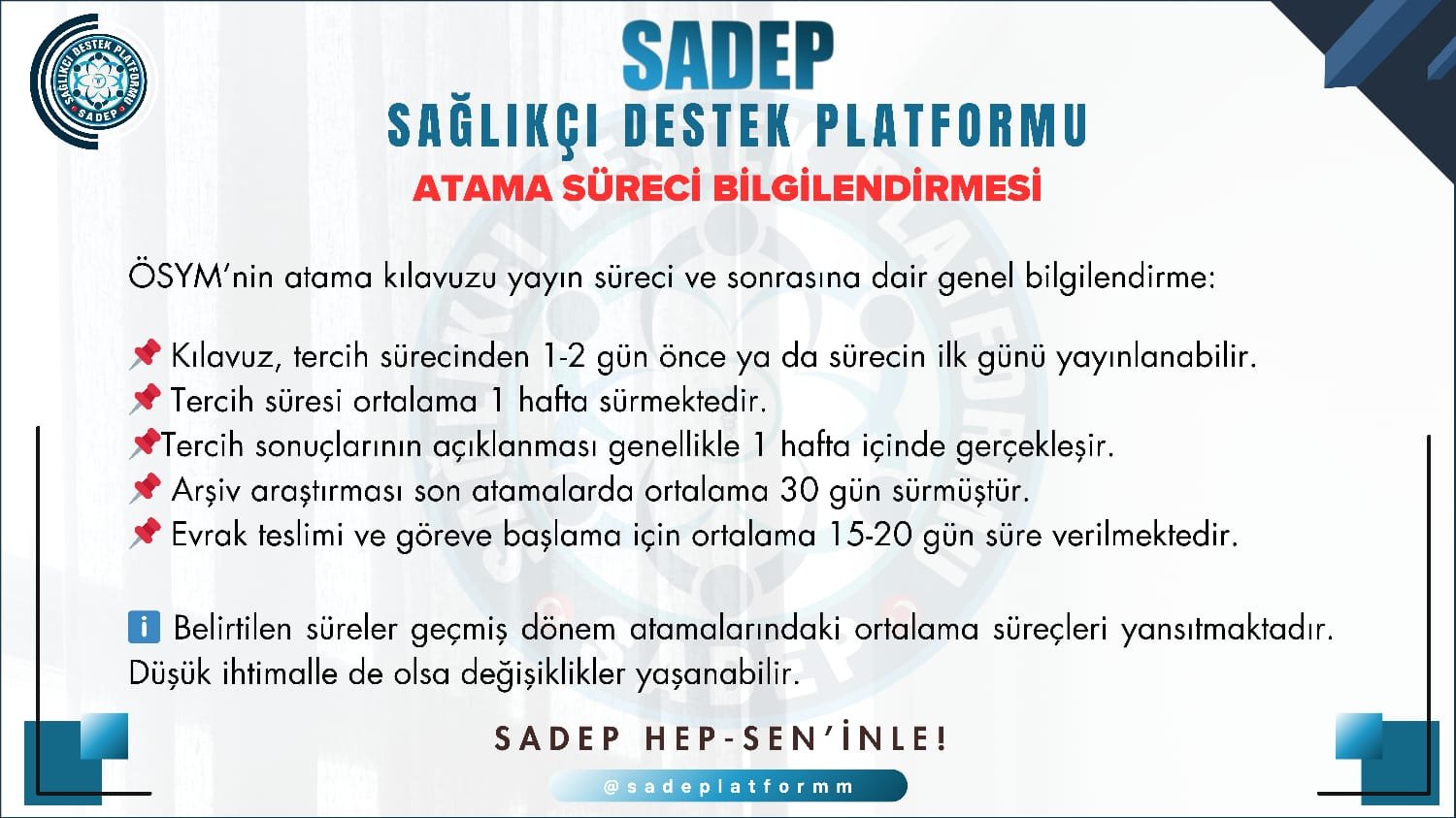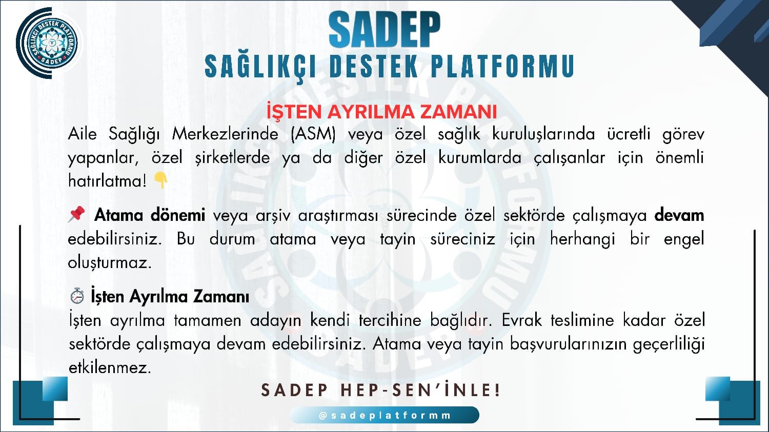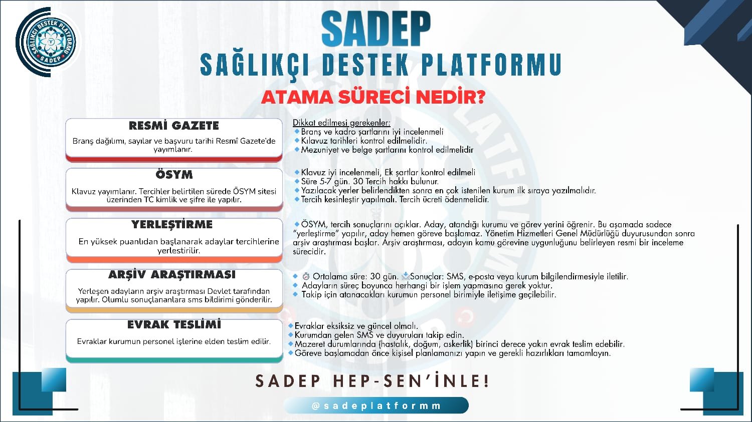 Sağlıkçı Destek Platformu Atama sürecinde sağlık çalışanlarının yalnız hissetmemesi, bilgi eksikliği nedeniyle yanlış tercihler yapmaması için oluşturulmuş bir platformdur. Sosyal medya üzerinden geniş bir toplulukla etkileşim içinde olarak sağlık personellerine destek sağlıyoruz. Misyonumuz Atama sürecinden memurluk hayatına kadar sağlık çalışanlarını desteklemek. Bilgiye ulaşımı kolaylaştırarak, doğru tercih yapmalarını sağlamak. Sağlık çalışanlarının mesleki kariyerlerinde rehber olmak. Vizyonumuz […]